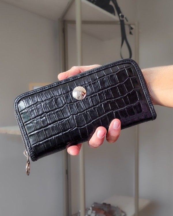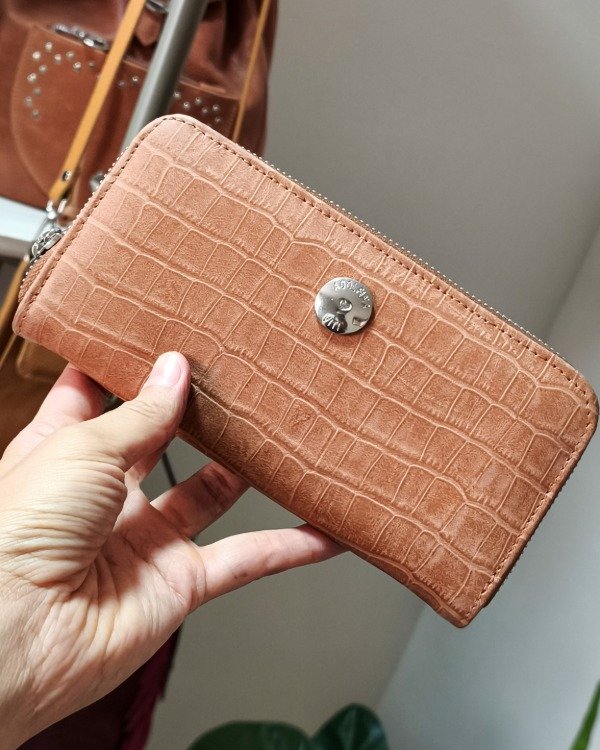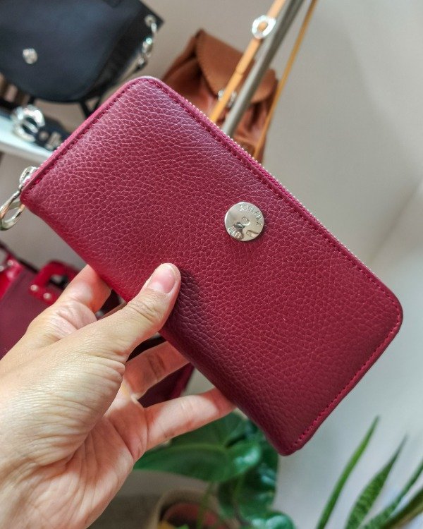 Billetera tipo canopla con cierre, confeccionada en cuero vacuno.